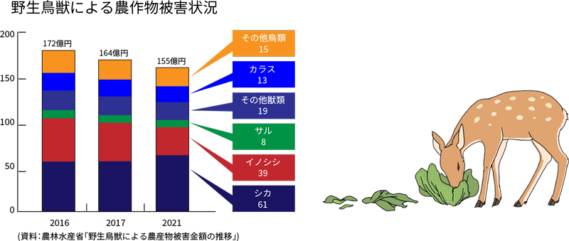 正解は 2 です。 被害金額の80%が獣類で、その内シカによる被害が最も多い。被害額は2017年と2021年を比較すると、約9億円減少しており農林水産省の被害対策が効果を上げている。