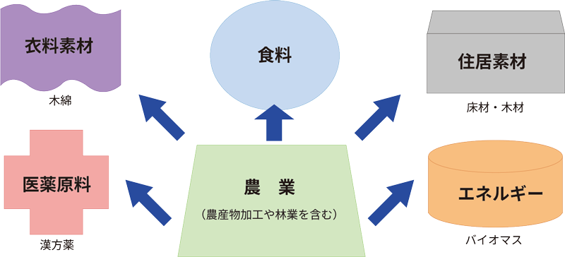 正解は 3 です。 農業は綿や絹、麻などの衣料の素材や、木材などの住居の素材、植物由来の医薬品の原料の生産、家畜の排せつ物や森林の間伐材、トウモロコシなどのバイオマス(化石燃料を除く再生可能な生物由来の資源)を利用したエネルギー生産にも関わっています。