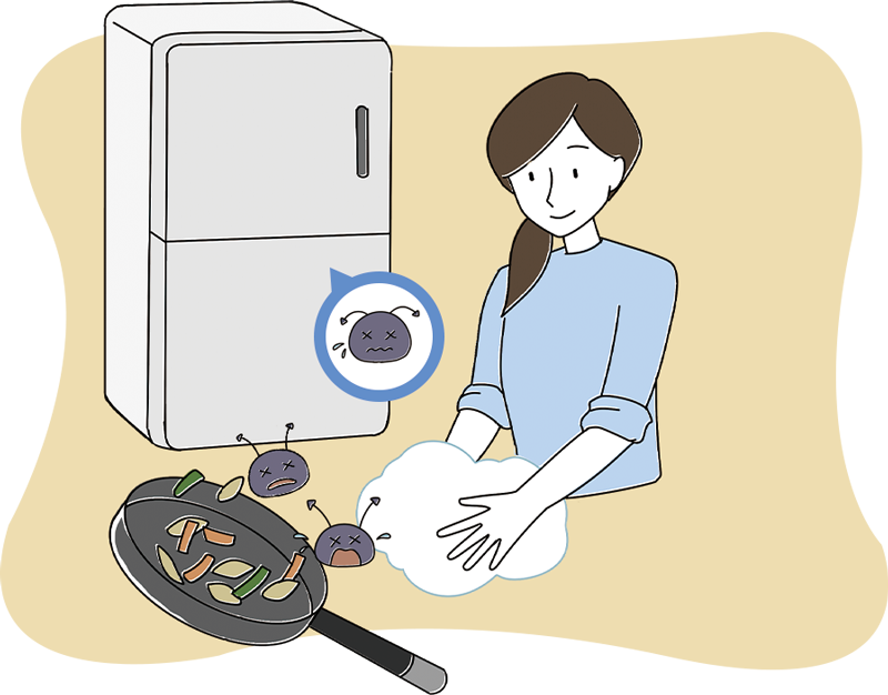 正解は 2 です。 冷凍庫や冷蔵庫のつめ過ぎには注意。目安は約7割です。 また、食中毒予防の原則は、食中毒の原因となる細菌を「つけない」「増やさない」「やっつける(殺菌する)」 の3つです。